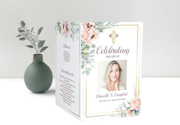 Gold Cross With Flowers Funeral Program Template - 4 Page